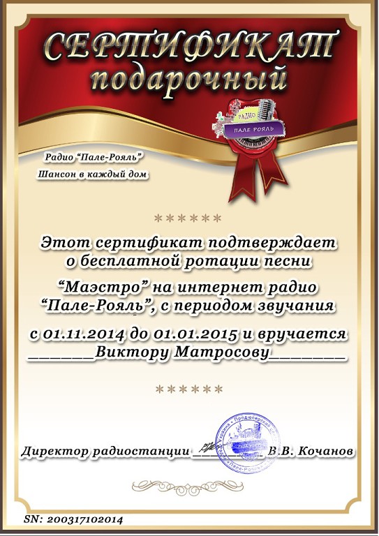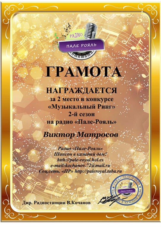 "Шансон". После успешного вступления на фестивалях и различных концертах эстрадной песни Виктор взялся за создание уже другого, абсолютно нового, проекта под названием "Виктор Матросов & Со". В проекте приняли участие: Ольга Беккер - Бек-вокал, Сергей Райс - Соло-гитара и Олег Иванов в роли Бас-гитариста, на стихи которого Виктор и Оля записали замечательный, танцевальный, дует "Это было кино". Так-же на стихи Олега были записаны ряд многих других, замечательных, песен, как например - "Она, несравненная женщина", "Лови момент" и другие, музыку к которым написал уже сам Виктор. Там-же Виктор, параллельно, начинает интересный, я даже сказал бы загадочный, тандем с певицей АнтониА. Они работают над созданием двух совместных проектов "Мания" и "Созданы любить", которые были исполнены дуетом и записанны на стихи Антонии и музыку Виктора Матросова. Как и все предыдущие песни, эти новые работы нашли множество своих слушателей и завоевали их сердца.